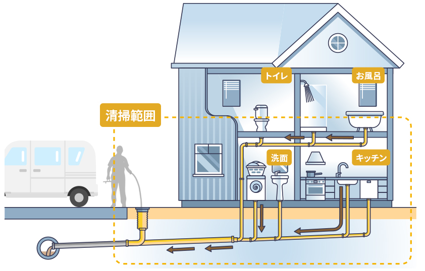 弊社の排水管清掃では、屋内の排水口、キッチン・お風呂・洗面所・洗濯場の排水管から、外の排水マスまで高圧洗浄機で排水管をまるごと清掃します。施工時間は、大きな詰まりが無い場合、一般的な戸建住宅(50坪未満)ですと、約1時間~1時間30分程度、二世帯住宅になると約2時間くらいが目安となります。